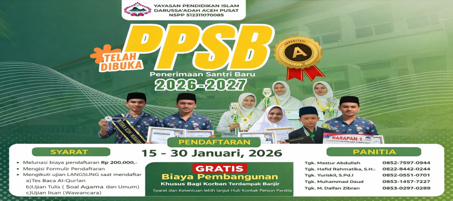 Yayasan Pendidikan Islam Darussa’adah Aceh Pusat secara resmi membuka Penerimaan Santri Baru (PSB) Tahun Ajaran 2026–2027. Kami mengundang putra-putri te
