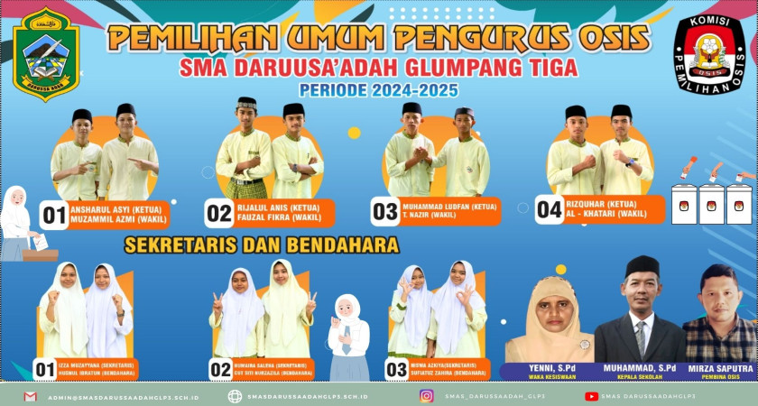 SMA Swasta Darussa'adah Glumpang Tiga menyelenggarakan pemilihan Ketua dan Wakil Ketua OSIS periode 2024/2025 pada Senin (26/8/2024). Pemilihan ini dilakukan melalui proses demokrasi yang memberikan kesempatan bagi setiap siswa-siswi SMA Swasta Darussa'adah Glumpang Tiga untuk berpartisipasi secara aktif dalam pemungutan suara. Kegiatan ini juga dilaksanakan sebagai bagian dari penerapan Projek Penguatan Profil Pelajar Pancasila (P5). Terlihat antusiasme para siswa-siswi saat mengikuti rangkaian pemilihan ketua dan wakil ketua OSIS SMA Swasta Darussa'adah Glumpang Tiga. Pemilihan dimulai pukul 08.00 – 11.00 WIB dilanjutkan dengan perhitungan suara pada pukul 13.00 WIB.